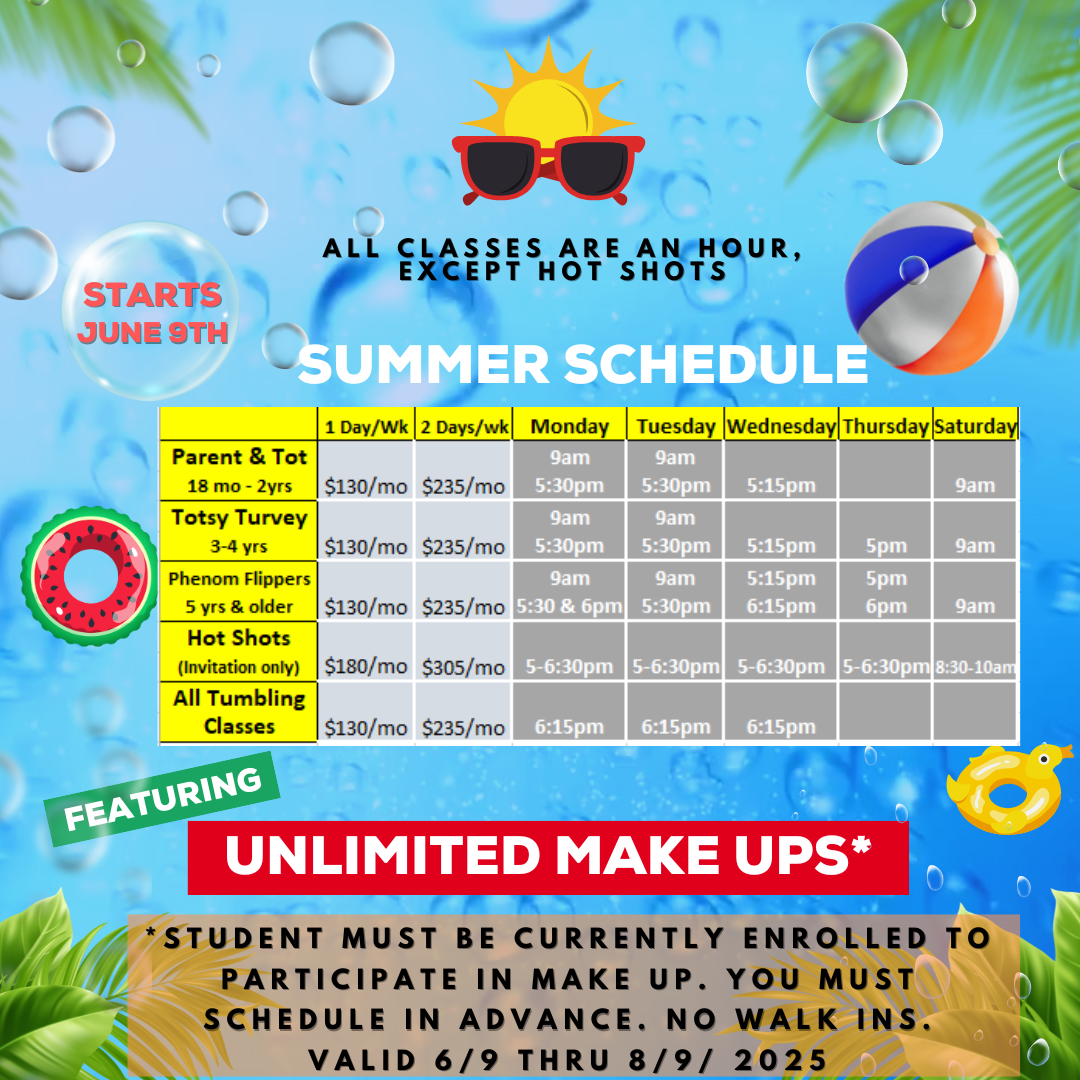 It is always best to attend your regularly scheduled class. When you know you will be unable to attend your class, please call or email our office to let us know. Just like college, your tuition pays for a class spot, REGARDLESS OF ATTENDANCE. However, as a courtesy, Phenom Gymnastics offers a make-up class. You will be regularly emailed as to when this specific make up open gym will take place. Student must be enrolled in class at the time of the make up open gym in order to participate.